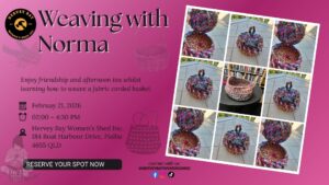 All materials provided. Enjoy friendship and afternoon tea whilst learning how to weave a fabric corded basket. Following on from Norma’s lesson in raffia weaving last year, she is back again to teach us new skills in upcycling old cloth material into a weaving cord which is versatile for making baskets, bags, bag straps, belts and more.